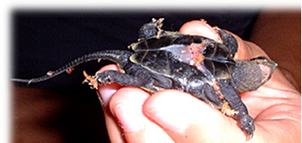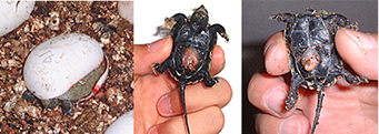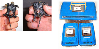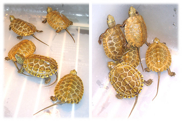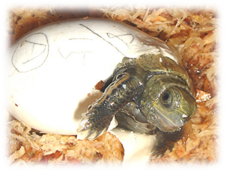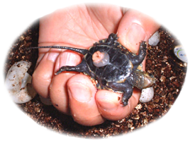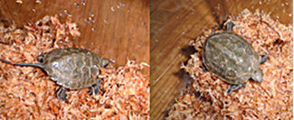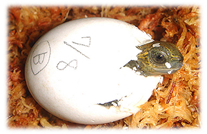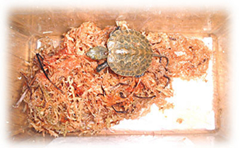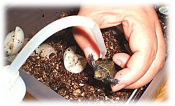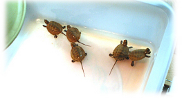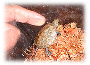 発見当時は動いていなかったので死んでいるのかと思ったようです。しかし、しばらくすると動き始め生きていることを確認。待ちに待った子ガメ誕生を確認した瞬間です。砂をはらってお腹を見るとすでにヨークサックがなかったようです。甲長約3cm、体重7グラム。サイズから察するに、孵化して1週間くらいではないかと思います。その日はプラケースに水苔を敷きそこにいれてやるとその中に潜って寝てしまいました。数日後、水苔を撤去し水を張った飼育に移行。2005年1月現在甲長約6cm、順調に発育中。約2倍の大きさに育ちました。