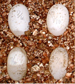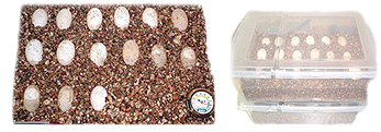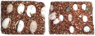 ●バーミキュライト(園芸用の用土。写真では卵の下に敷いてあります)ひる石を高温で焼成したもので、無菌、無肥料の中性土です。もちろん卵や子ガメに無害です。保水力、通気性に富み、本来は主に土壌改良剤として使用します。これを孵化用の卵のベッドとして使用します。