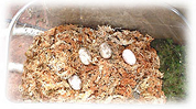 ●湿度管理について。バーミキュライトが乾燥しないように水分の補給をしてください。うちでは細い管の付いた水差しで卵に直接水がかからぬように、周りの土に水をさしました。ベタベタにはしないでください。あくまで湿らせる程度。ウチではフタをした状態で、湿度計で約80%キープをこころがけました。霧吹きでもよいようですが、卵に直接水がかかるとすぐに拭き取らないと表面にカビが生えることもありますので注意してください。また、バーミキュライトでなくても赤玉土でも構いません。しかし、湿らせた水苔はあまりおすすめしません。水分をしっかり絞って使用しないと、孵化までの約2ヶ月間には、虫が湧いたり卵がカビる可能性が大きくなるからです。